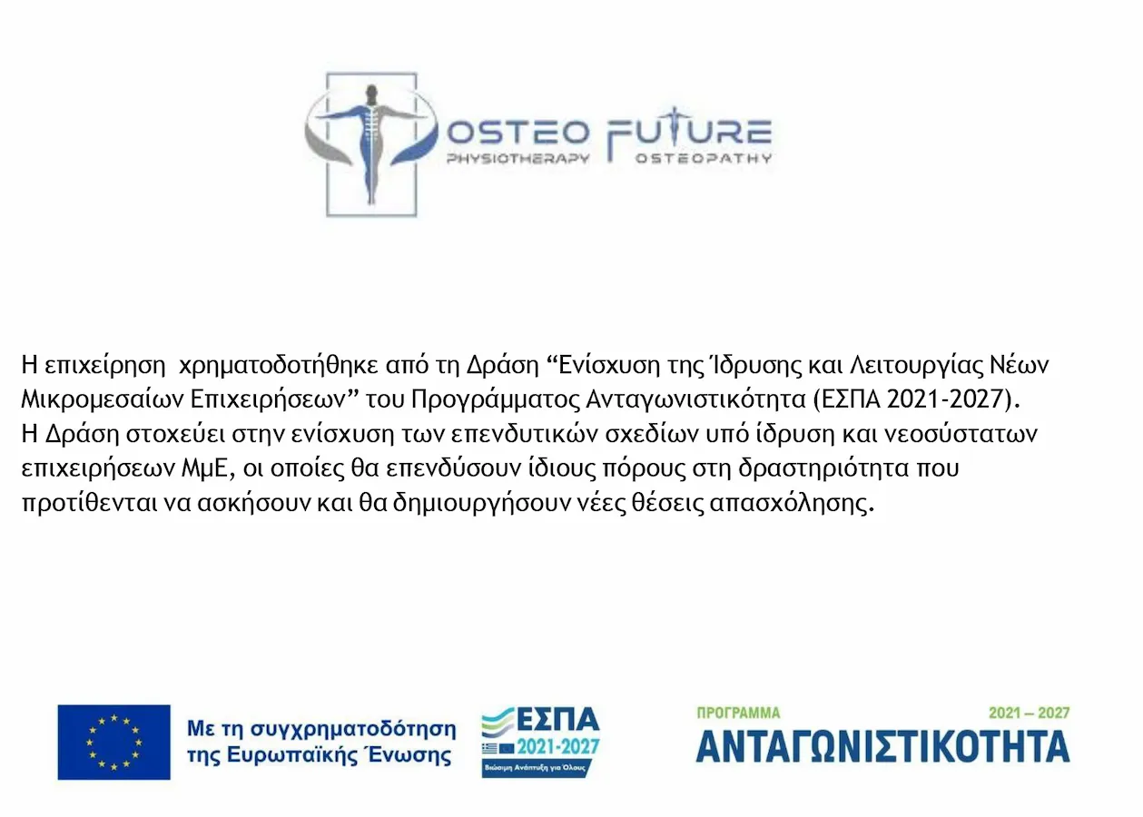 Στο κέντρο Οστεοπαθητικής και Φυσικοθεραπείας Osteofuture προσφέρουμε όλες τις θεραπευτικές υπηρεσίες που χρειάζονται για να καλύψουμε τις ανάγκες ενηλίκων, ηλικιωμένων και παιδιατρικών ασθενών. Εδώ η θεραπεία σας πραγματοποιείται από πιστοποιημένους και εγγεκριμένους θεραπευτές που θα εφαρμόσουν όλη τη γνώση και την εμπειρία που διαθέτουν προκειμένου να έχετε το καλύτερο αποτέλεσμα και να απολλαγείτε απο το πρόβλημά σας.